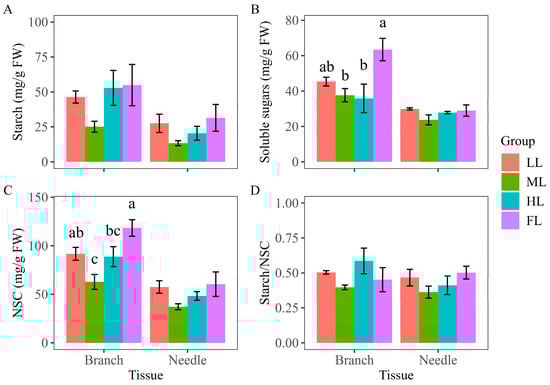 Comparison of non-structural carbohydrates in branches and needles of Pinus koraiensis under different light intensities: (A) starch, (B) soluble sugars, (C) NSC (starch + soluble sugars), and (D) starch/NSC concentrations in branches and needles of Pinus koraiensis under different light intensities. LL, low light; ML, moderate light; HL, high light levels; FL, full light. Different lowercase letters indicate significant differences between different light conditions, with p < 0.05 according to one-way ANOVA and an LSD post hoc test; non-significant results were omitted. Values are means ± SE, with n = 3 biological replicates.