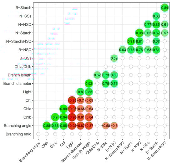 Pearson correlation matrix of the correlation between different parameters (p < 0.05). Non-significant correlations were omitted (p > 0.05). Negative and positive correlations are given in red and green, respectively; the color gradient shows the strength of the correlation. N indicates needle traits, while B indicates branch traits.