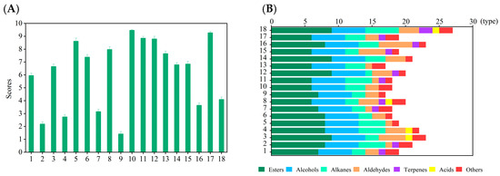 (A) Floral scent levels in the flowers of 18 crabapple cultivars. (B) Volatile compound types identified in the 18 cultivars. Numbers 1–18 represent the following cultivars: 1—‘Tamlin’, 2—‘Purple Classic’, 3—‘Harvest Gold’, 4—‘Flame’, 5—‘Kelsey’, 6—‘Tang-2’, 7—‘Donald Wyman’, 8—‘Prairifire’, 9—‘Sparkler’, 10—‘Royal Raindrops’, 11—‘Radiant’, 12—‘Purple Prince’, 13—‘Indian Magic’, 14—‘Profusion’, 15—‘Red Jewel’, 16—‘Spring Snow’, 17—‘Adams’, 18—‘Royalty’. The experiment included three biological replicates, and only compounds detected consistently in all three replicates were retained.