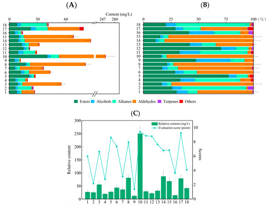 The distribution of aldehydes showed considerable variability among the cultivars, with over half (10 out of 18) displaying a substantially higher total aldehyde content compared to others. Notably, ‘Royal Raindrops’ demonstrated the peak aldehyde concentration at 197.02 mg/L. Similarly, the ester content varied significantly across the cultivars, with ‘Royal Raindrops’ also presenting the highest ester concentration at 40.82 mg/L, while ‘Sparkler’ recorded the lowest at 5.79 mg/L. All cultivars exhibited detectable levels of alcohol, maintaining a 100% detection rate. The coefficient of variation for total alcohol content was significantly lower (CV = 36.20%) than that for esters (CV = 67.67%), indicating a more conserved nature of alcohol biosynthesis pathways among the cultivars. A key validation step confirmed that the overall trends in total volatile compound contents were generally consistent with the sensory evaluation scores as illustrated in Figure 3C.