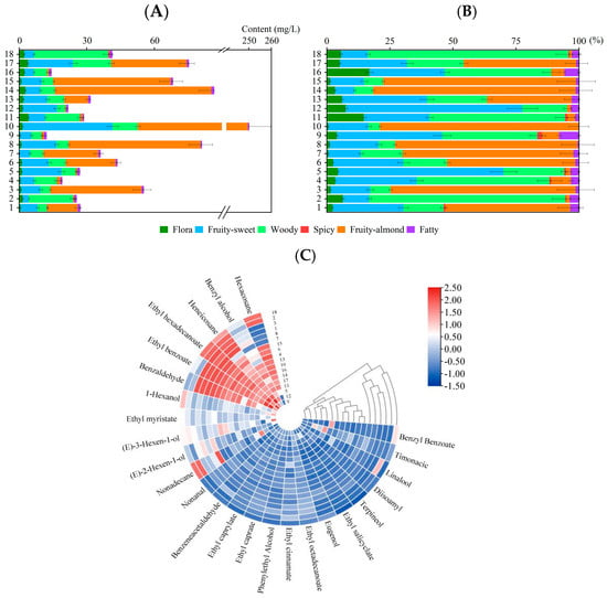 The odor characteristics of the major volatile compounds facilitated the classification of the aromas from 18 crabapple cultivars into six scent note groups: floral, fruity-almond, fatty, fruity-sweet, woody, and spicy. Figure 4A,B depict the total content and relative proportions of each volatile class across the cultivars. The scent categories of fruity-almond, fruity-sweet, and woody emerged as the most dominant, collectively comprising over 77% of the total volatile composition among the cultivars.