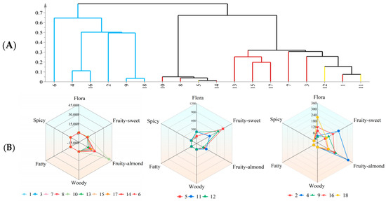 HCA and radar chart of volatile characteristics in 18 crabapple cultivars. Numbers 1–18 represent the following cultivars: 1—‘Tamlin’, 2—‘Purple Classic’, 3—‘Harvest Gold’, 4—‘Flame’, 5—‘Kelsey’, 6—‘Tang-2’, 7—‘Donald Wyman’, 8—‘Prairifire’, 9—‘Sparkler’, 10—‘Royal Raindrops’, 11—‘Radiant’, 12—‘Purple Prince’, 13—‘Indian Magic’, 14—‘Profusion’, 15—‘Red Jewel’, 16—‘Spring Snow’, 17—‘Adams’, 18—‘Royalty’. (A) HCA dendrogram of the 18 crabapple cultivars. Red, yellow, and blue represent the fruit-almond, fruit-sweet, and mixed aroma types, respectively. (B) Radar chart of the 18 crabapple cultivars.