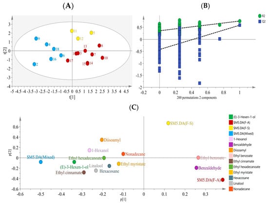 OPLS-DA analysis and model cross-validation based on the relative contents of aroma compounds in 18 crabapple cultivars. Numbers 1–18 represent the following cultivars: 1—‘Tamlin’, 2—‘Purple Classic’, 3—‘Harvest Gold’, 4—‘Flame’, 5—‘Kelsey’, 6—‘Tang-2’, 7—‘Donald Wyman’, 8—‘Prairifire’, 9—‘Sparkler’, 10—‘Royal Raindrops’, 11—‘Radiant’, 12—‘Purple Prince’, 13—‘Indian Magic’, 14—‘Profusion’, 15—‘Red Jewel’, 16—‘Spring Snow’, 17—‘Adams’, 18—‘Royalty’. (A) OPLS-DA score plot based on the relative aroma contents of the 18 crabapple cultivars. Red, yellow, and blue represent the fruit-almond, fruit-sweet, and mixed aroma types, respectively. (B) Model cross-validation results. (C) Loading plot showing the contributions of individual volatile compounds to the separation of aroma types along the principal components. Abbreviations: F-A, fruit-almond type; F-S, fruit-sweet type.