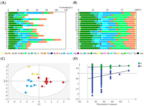 Relative contents of the amino acids and OPLS-DA analysis in 18 crabapple cultivars. Numbers 1–18 represent the following cultivars: 1—‘Tamlin’, 2—‘Purple Classic’, 3—‘Harvest Gold’, 4—‘Flame’, 5—‘Kelsey’, 6—‘Tang-2’, 7—‘Donald Wyman’, 8—‘Prairifire’, 9—‘Sparkler’, 10—‘Royal Raindrops’, 11—‘Radiant’, 12—‘Purple Prince’, 13—‘Indian Magic’, 14—‘Profusion’, 15—‘Red Jewel’, 16—‘Spring Snow’, 17—‘Adams’, 18—‘Royalty’. (A) Relative contents of the amino acids in the 18 crabapple cultivars. (B) Proportions of the 21 amino acids in the 18 crabapple cultivars. (C) OPLS-DA score plot based on the relative amino acid contents of the 18 crabapple cultivars. Red, yellow, and blue represent the fruit-almond, fruit-sweet, and mixed aroma types, respectively. (D) Model cross-validation results.