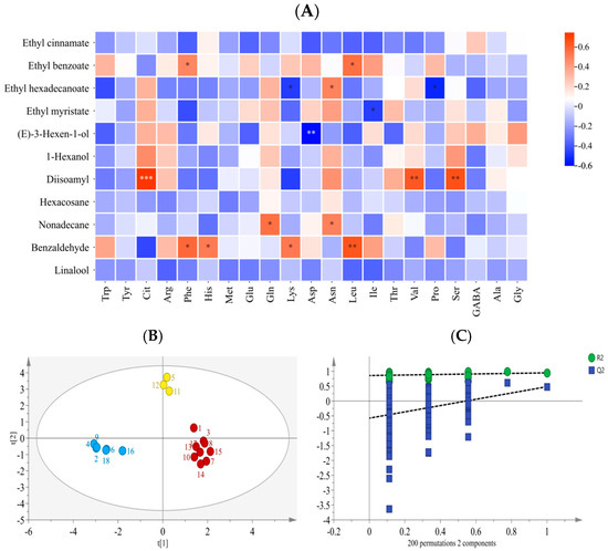 Correlation analysis of 18 crabapple cultivars. Numbers 1–18 represent the following cultivars: 1—‘Tamlin’, 2—‘Purple Classic’, 3—‘Harvest Gold’, 4—‘Flame’, 5—‘Kelsey’, 6—‘Tang-2’, 7—‘Donald Wyman’, 8—‘Prairifire’, 9—‘Sparkler’, 10—‘Royal Raindrops’, 11—‘Radiant’, 12—‘Purple Prince’, 13—‘Indian Magic’, 14—‘Profusion’, 15—‘Red Jewel’, 16—‘Spring Snow’, 17—‘Adams’, 18—‘Royalty’. (A) Heatmap showing the correlations between relative contents of aroma compounds and amino acids. * indicates significance at p < 0.05, ** at p < 0.01, and *** at p < 0.001. (B) OPLS-DA score plot based on the combined relative contents of amino acids and volatile compounds in the 18 crabapple cultivars. Red, yellow, and blue represent the fruit-almond, fruit-sweet, and mixed aroma types, respectively. (C) Model cross-validation results.