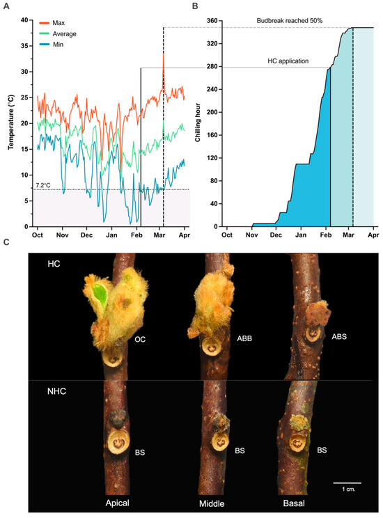 Weather conditions and budbreak characteristics of low-chill kiwifruit ‘Bruno’ grown in a highland tropical climate in Thailand. (A) Daily temperatures recorded during the 2017–2018 season. The orange, green, and blue lines represent daily maximum, daily average, and daily minimum temperatures, respectively. The horizontal dotted line indicates the critical chilling threshold of 7.2 °C, and the shaded gray region below represents the temperature range (0 °C to 7.2 °C) used for chilling hour calculation. (B) Chilling accumulation calculated as the total hours of chilling exposure when temperatures were between 0 °C and 7.2 °C. The solid line marks the date of HC application, and the dashed line indicates the day on when 50% budbreak was observed at the apical position of HC-treated canes. (C) Examples of bud development under HC-treated (HC) and non-treated (NHC) conditions across different bud positions at 28 DAT. Bud developmental stages were defined as open cluster (OC), advanced bud burst (ABB), advanced bud swell (ABS), and bud swell (BS) [32]. Scale bar = 1 cm.