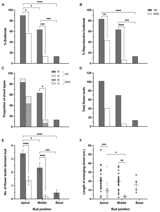 Effect of HC on percentage of budbreak (A), percentage of reproductive budbreak and number (B), proportion of emerging shoot types (C)—reproductive shoots (R) and unidentifiable shoots (U)—total flower buds (D), number of flower buds per dormant bud (E), and length of emerging shoots (F) among bud positions. Closed bars or dots represent HC-treated buds, and open bars or dots represent non-treated buds. Bars and error bars indicate means and SEMs. Comparisons of percentage of budbreak, percentage of reproductive budbreak, and proportion of shoot types between treatments were performed using Fisher’s exact test. Comparisons of the number of flower buds per dormant bud and length of emerging shoots between treatments were performed using the Mann–Whitney U test. Statistically significant differences are indicated by asterisks: * (p < 0.05), ** (p < 0.005), *** (p < 0.001), and **** (p < 0.0001).