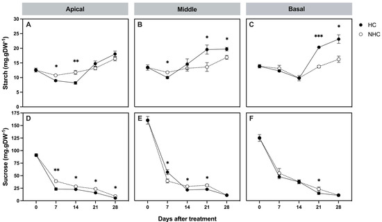 Changes in starch (A–C) and sucrose concentrations (D–F) at different bud positions from day 0 to 28 DAT following HC application. Closed symbols represent HC-treated canes, and open symbols represent non-treated canes. Dots and error bars indicate means and SEMs of four replications. Comparisons of carbohydrate concentrations between treatments on each sampling day were analyzed by an independent-sample t-test. Statistically significant differences are indicated by asterisks: * (p < 0.05), ** (p < 0.005), and *** (p < 0.001).