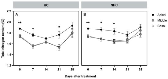 Changes in total nitrogen content in HC-treated canes (A) and non-treated canes (B) among bud positions. Black, grey, and clear dots indicate the apical, middle, and basal positions, respectively. Dots and error bars represent means and SEMs of three replications. Comparisons of nitrogen concentration among bud positions on each sampling day were analyzed by a one-way ANOVA followed by Tukey’s multiple-comparison test. Statistically significant differences between the apical position and the lower bud positions are indicated by asterisks: * (p < 0.05), and ** (p < 0.005).