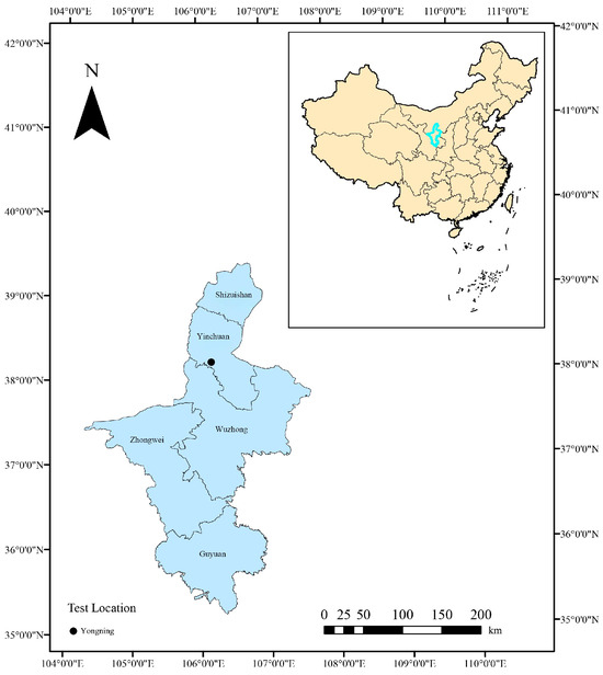 The tested flowering Chinese cabbage (Brassica campestris L. ssp. chinensis (L.) var. utilis Tsen et Lee) cultivar was ‘Jianye-70’, with a growth cycle of 55–65 days, provided by Ningxia Yuefeng Ecological Agriculture Technology Co., Ltd., Yinchuan, China. Sowing occurred on 10 September 2022 and 10 September 2023. The trials were conducted from 10 September to 5 November 2022, and 10 September to 5 November 2023, at a vegetable supply base for Hong Kong in Lijun Town, Yongning County, Yinchuan City, Ningxia (38°27′ N, 106°25′ E) (Figure 1). The region features a temperate arid climate, with an average altitude of 1223 m, mean annual temperature of 8.9 °C, and mean annual precipitation of 179.6 mm. As an intensive vegetable production area under long-term agricultural use, management records indicated that the experimental field had been continuously cultivated with cruciferous vegetables for more than 3 years. The study plots had undergone long-term conventional fertilization management prior to the experiment. Pre-trial baseline soil properties were pH 8.75, electrical conductivity (EC) 0.81 mS·cm−1, organic matter 5.83 g·kg−1, total nitrogen 0.36 g·kg−1, available nitrogen 1.45 mg·kg−1, available phosphorus 150.47 mg·kg−1, and available potassium 33.41 mg·kg−1.