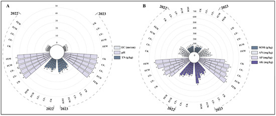 Compared to CF1, the CK treatment significantly decreased total nitrogen (TN) content, with reductions of 18.31% in 2022 and 20.40% in 2023. Similarly, the CF2 treatment significantly reduced TN relative to CF1, by 12.64% in 2022 and 6.29% in 2023. In 2022, the FEM treatment significantly increased TN by 8.86% compared to FCM. In 2023, FEM significantly enhanced TN compared to both CF1 and FCM, with increases of 12.71% and 8.85%, respectively. Organic fertilizer amendments universally increased soil organic matter (SOM). FEM increased SOM by 10.49% in 2022 and 11.24% in 2023 compared to CF1. Furthermore, FEM resulted in significantly higher SOM than FCM in 2022. Regarding alkaline nitrogen (AN), differences were observed between FEM and CF1 in both years: FEM increased alkaline nitrogen (AN) by 16.95% in 2022 and 16.67% in 2023 relative to CF1. In contrast, the FCM treatment showed no significant change in alkaline nitrogen (AN) compared to CF1. Organic fertilizer amendments consistently enhanced available phosphorus (AP) and available potassium (AK) levels, with similar trends in both years. Specifically, for available phosphorus (AP) in 2022, both FCM and FEM treatments increased available phosphorus (AP) compared to CF1 (15.85% and 20.33%, respectively). In 2023, FEM increased available phosphorus (AP) by 10.31% relative to CF1, and a significant difference was observed between FCM and FEM, with FEM exhibiting a 9.31% greater increase than FCM. For available potassium (AK) in 2022, FCM and FEM increased available potassium (AK) compared to CF1 by 16.43% and 29.62%, respectively, and FEM showed a significant increase over FCM. In 2023, FCM and FEM increased available potassium (AK) by 16.76% and 54.26%, respectively, relative to CF1. FEM’s available potassium (AK) increase was significantly greater than FCM’s, amounting to a 32.11% higher value.