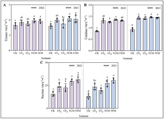 (A) Urease activity in soil under different treatments; (B) Catalase activity in soil under different treatments; (C) Sucrase activity in soil under different treatments. Lowercase letters (a, b, c, d) indicate significant differences (p < 0.05) among treatments within an indicator-year (different letters: significant; same letter: non-significant). Error bars (vertical lines with end caps) represent data variability (SE or SD); greater length indicates higher dispersion among replicates. Black dots plot raw data points (replicate measurements), showing actual data distribution to complement the mean (bar height) and error bars, providing a comprehensive view of variability.