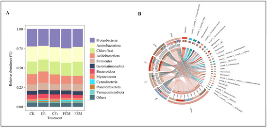 For the composition of bacterial community structure at the phylum level (Figure 4A), taxa with average relative abundance <1% were categorized as “Others,” yielding 12 taxonomic groups. The top-five dominant phyla were Proteobacteria (21.69–24.80%), Actinobacteria (17.56–19.49%), Chloroflexi (15.33–18.08%), Acidobacteria (10.17–14.47%), and Firmicutes (7.96–9.56%). Compared to CF1, the FCM treatment increased Proteobacteria abundance, while both FCM and FEM treatments elevated Firmicutes abundance. FEM enhanced Chloroflexi abundance significantly relative to CF1 and FCM. Organic fertilizer amendments reduced Acidobacteria and Bacteroidetes abundances: FCM decreased Acidobacteria by 32.44% and Bacteroidetes by 16.49%, whereas FEM reduced Acidobacteria by 30.45% and Bacteroidetes by 26.52%, with FEM showing significantly greater Bacteroidetes reduction than FCM.