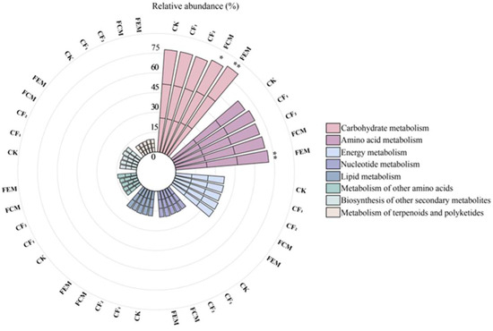 Notably, FCM and FEM treatments significantly enhanced carbohydrate metabolism compared to CF1, with FEM showing highly significant differences (p < 0.01). Amino acid metabolism under FEM reached extreme significance (p < 0.01) relative to CF1. These results demonstrate that organic fertilizer amendments specifically bolster microbial carbohydrate and amino acid metabolic functionalities. No significant alterations were observed in other metabolic pathways.