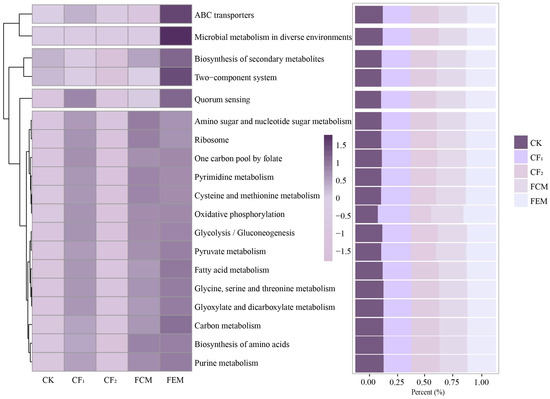 Figure 6 shows Level 3 KEGG metabolic pathways, listing the top-19 KEGG orthologous function predictions based on relative abundance. The results of the Level 3 KEGG orthologous function prediction show that, among the top-19 metabolic pathways, the relative abundance of the ABC transporters pathway in the FEM treatment is higher than in the CF1 and FCM treatments, with an increase of 1.86% and 4.19%, respectively. The relative abundance of the Microbial metabolism in diverse environments pathway in the FEM treatment increased by 2.13% and 2.12% compared to the CF1 and FCM treatments, respectively. The relative abundance of the Biosynthesis of secondary metabolites pathway in the FEM treatment increased by 1.08% compared to the CF1 treatment, with no significant change compared to the FCM treatment. The relative abundance of the Two-component system pathway in the FEM treatment increased by 2.47% and 2.24% compared to the CF1 and FCM treatments, respectively. The relative abundance of the Fatty acid metabolism pathway in the FEM treatment was higher than in the CF1 and FCM treatments, with an increase of 2.19% and 2.34%, respectively. The relative abundance of the Quorum sensing pathway in the FEM treatment increased by 3.39% compared to the FCM treatment, with no significant change compared to the CF1 treatment. The relative abundance of the Purine metabolism pathway in the FEM treatment increased by 1.56% compared to the CF1 treatment, with no significant change compared to the FCM treatment. The relative abundance of the Pyruvate metabolism pathway in the FEM treatment increased by 1.62% compared to the CF1 treatment, with no significant change compared to the FCM treatment. In the Pyrimidine metabolism pathway, the relative abundance of the FCM treatment increased by 1.49% compared to the CF1 treatment.