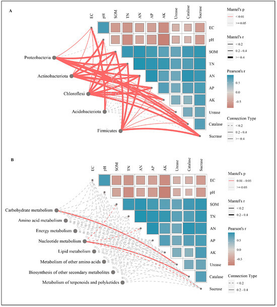Microbial community (A), metabolic function (B), and soil environmental factors Mantel test.