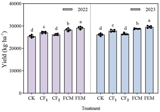 As depicted in Figure 8, the per-hectare yield of flowering Chinese cabbage varied significantly among treatments. In 2022, CK and CF2 reduced yields by 6.38% and 3.51%, respectively, compared to CF1. Organic fertilizer amendments (FCM and FEM) enhanced productivity, with FCM and FEM increasing yields by 4.29% and 7.34% relative to CF1, respectively. Notably, FEM outperformed FCM by 2.93%. In 2023, yield trends mirrored those of 2022: CK and CF2 diminished yields by 6.13% and 4.96%, respectively, versus CF1. FCM and FEM again surpassed CF1, achieving 3.30% and 6.17% yield increases. The superiority of FEM over FCM persisted, with a 2.78% yield advantage.