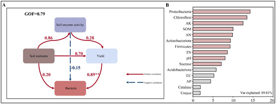 Figure 9A presents a partial least squares path analysis (PLS-PA) model constructed using Chinese flowering cabbage yield, soil nutrients, soil enzyme activities, and bacterial community structure to delineate the direct and indirect effects of soil environmental factors on yield. The PLS model revealed that soil nutrients and bacterial community structure exerted positive impacts on yield, with the bacterial community structure showing a highly significant positive effect (path coefficient = 0.89, p < 0.01). Conversely, soil enzyme activities negatively influenced yield (path coefficient = −0.15). Soil nutrients positively affected both soil enzyme activities (path coefficient = 0.86) and bacterial community structure (path coefficient = 0.70), while soil enzyme activities exhibited a positive correlation with bacterial community structure (path coefficient = 0.28). Additionally, a Random Forest model ranked the importance of 15 soil environmental factors influencing yield. As shown in Figure 9B, the model achieved an explanatory power of 89.81%, with the key factors ranked in descending order of importance as Proteobacteria, Chloroflexi, available potassium (AK), soil organic matter (SOM), available nitrogen (AN), Actinobacteria, Firmicutes, total nitrogen (TN), pH, and sucrase activity. In contrast, Acidobacteria, electrical conductivity (EC), available phosphorus (AP), catalase, and urease activities demonstrated relatively minor contributions to yield variability.