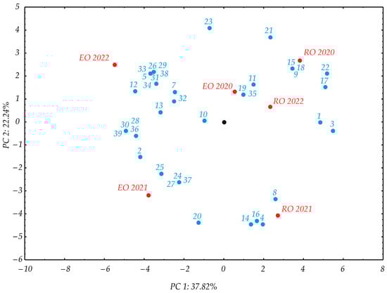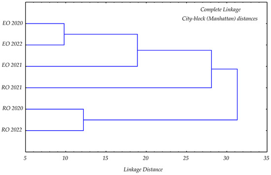 Cluster analysis was performed according to the dendrogram of volatile compounds obtained in Lemon catnip essential oil and recovery oil, using Complete Linkage and City-block (Manhattan) distances, as shown in Figure 4. The two main clusters were evident: one primarily consisting of the essential oil samples (EO 2020 and EO 2022 forming the tightest sub-cluster, with EO 2021 joining them at a slightly greater distance), and another composed of the recovery oil (RO 2020 and RO 2022 forming a relatively close pair, which then merges with RO 2021 at a larger linkage distance), indicating distinct groupings between the essential oil and recovery oil categories across the observed years, while also showing within-category similarities.