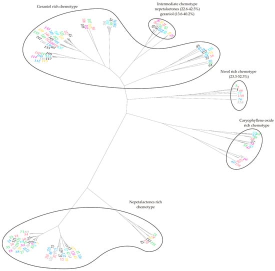 Using the data presented in Table 3, the topology of the unrooted phylogenetic treet was created to illustrate the similarities between the literature and the studied samples. Based on the topology of the unrooted phylogenetic tree, several distinct clades were evident, reflecting varying degrees of proximity within the factor space. Practically, it can be said that five different chemotypes of catnip are grouped, with two major groups being particularly noticeable: one comprising samples dominated by (1) nepetalactones (below), and the other consisting of (2) geraniol-rich and (3) nerol-rich chemotypes (above), which include Lemon catnip. In addition, an intermediate chemotype (4) and a caryophyllene oxide–rich chemotype (5) were also observed.