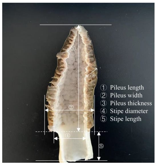In accordance with the Guidelines for Specificity, Consistency and Stability Testing of Plant Varieties (NY/T4211-2022) [15] applicable in China, the dimensions of stipe length, stipe diameter, pileus thickness, pileus width, and pileus length were measured using a vernier caliper (Figure 1). Furthermore, the weight of each of the randomly selected fruiting bodies was recorded to calculate the average weight, and the plot yield was determined by weighing.