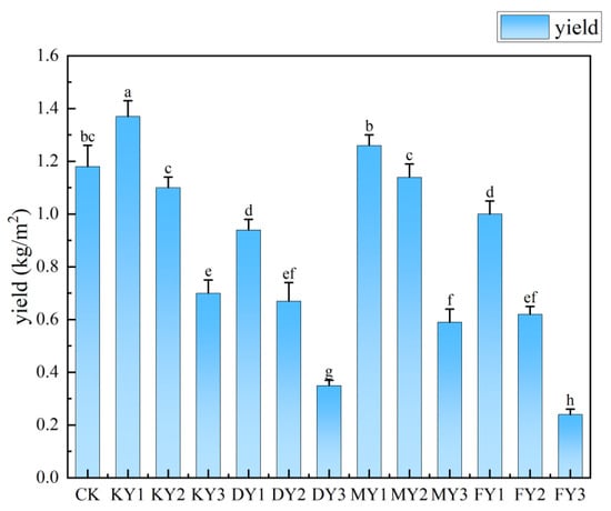 According to the data presented in Figure 2, among the treatments in which wheat grains were replaced, the rice bran (K) treatment achieved the highest unit yield (kg/m2), followed by the cottonseed hulls (M) treatment. The production of treatments with soybean meal (D) and fermented maize stover (F) substitutions was relatively low. Specifically, when the proportion of wheat grains was 30%, the yields of the treatments were as follows: KY1 > MY1 > CK > FY1 > DY1. The yield of the KY1 treatment was significantly higher than that of the CK group (p < 0.05), while there was no significant difference in yield between the MY1 treatment and the CK group. When the proportion of wheat grains was reduced to 15%, the yields were as follows: CK > MY2 > KY2 > DY2 > FY2. There were no significant differences in yield between the KY2 and MY2 treatments and the CK group, indicating that rice bran and cottonseed hulls could effectively provide nutrients at a 15% wheat grains proportion. When the substrates completely replaced wheat grains, the yields were as follows: CK > KY3 > MY3 > DY3 > FY3. Among them, the mushroom emergence density in the DY3 and FY3 treatments was significantly sparse, and the growth rate of fruiting bodies was slow. Although the FY3 treatment had significantly higher pileus thickness and weight of a single fruiting body than the CK group, its overall yield was significantly lower than that of other treatment groups.
