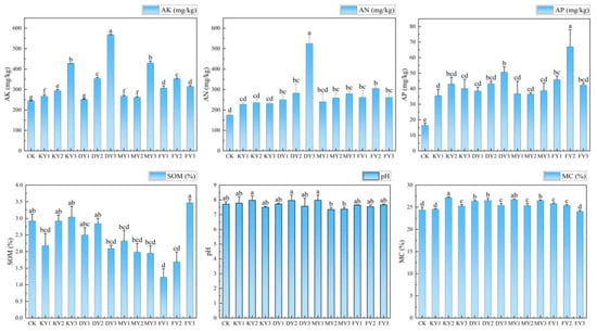 Effects of different nutrient bag formulations on soil physicochemical properties. Different lowercase letters indicate significant differences (p < 0.05). AN: alkali-hydrolysable nitrogen in soil; AP: available phosphorus in soil; AK: available potassium in soil; SOM: soil organic matter; MC: soil moisture content.