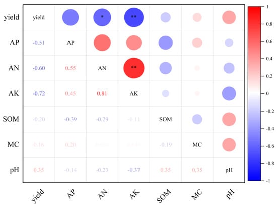 Pearson’s correlation heatmap illustrating the relationship between soil physicochemical properties and yield under different nutrient bag formulations. In the figure, red indicates a positive correlation, while blue indicates a negative correlation. The size of the circles represents the strength of the correlation; larger circles denote stronger correlations, and smaller circles indicate weaker correlations. An asterisk (*) signifies a significant correlation (p < 0.05), and two asterisks (**) denote an extremely significant correlation (p < 0.01). AN: alkali-hydrolysable nitrogen in soil; AP: available phosphorus in soil; AK: available potassium in soil; SOM: soil organic matter; MC: soil moisture content.