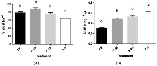 In absolute terms, combining all results for plant height and SPAD readings at 158 DAP, the treatment F-50 corresponded to the best vegetative growth, even if a reduction of 50% of total macronutrients was applied compared with CF. In line with the vegetative parameters, the maximum yield (Figure 2A) was achieved in treatment F-50, which gave a production of 88.7 t ha−1, roughly 10% higher compared with CF. Remarkably, the “intermediate” treatment F-25 showed a production of 76 t ha−1, which is not significantly different from CF. Therefore, the F-50 and F-25 treatments showed NUE values 40% higher compared with CF, but without any significant reduction in the final yield. These findings are in line with Salo [28] and Jensen and Sanders [29], who demonstrated that reduced fertilizations compared with commercial practices, or even residual N mineralization, are enough to sustain an appreciable yield [28,29].