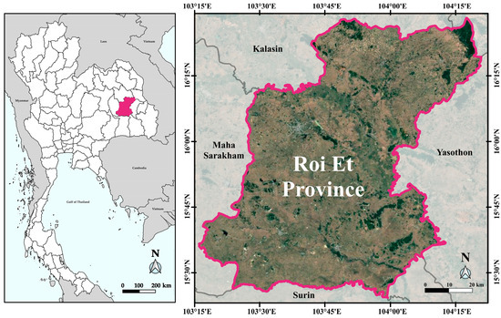 Roi Et Province is located in the central part of Northeast Thailand (Figure 1), covering an area of approximately 8317 km2. It shares borders with the provinces of Kalasin, Mukdahan, Yasothon, Sisaket, and Surin. The province’s general topography is characterized by a plateau, ranging from 120 to 160 m above mean sea level. In the northern region, mountains connect to the Phu Phan Mountain range, while the central area consists of a rolling plain. The southern part of the province features a flat plain along the banks of the Mun River and its tributaries, including the Chi River, Plap Phla River, and Tao River. This extensive lowland area, known as Thung Kula Rong Hai, forms a basin-shaped plain. The region experiences a tropical monsoon climate, with heavy rainfall typically occurring from June to October, while the period from March to May is marked by hot and dry weather.