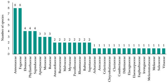 This study identified a diverse range of wild edible fruit plants used in ethnomedicine by Indigenous Isan communities in Roi Et Province, comprising 68 species from 32 families (Table 1 and Figure 2). The Annonaceae family exhibited the highest diversity, with eight species, demonstrating its essential role in local diets. The Fabaceae family followed closely, with seven species, reflecting the importance of legumes in the community’s ethnobotanical practices. Other families with notable diversity included Ebenaceae, Phyllanthaceae, and Sapindaceae, each represented by four species. Additionally, the Moraceae and Burseraceae families contributed three and two species, respectively, indicating their significance in traditional uses. Other families, such as Anacardiaceae, Apocynaceae, Burseraceae, Malvaceae, Myrtaceae, Passifloraceae, Rhamnaceae, Rubiaceae, and Sapotaceae, were each represented by two species, while a few families contributed one species each.