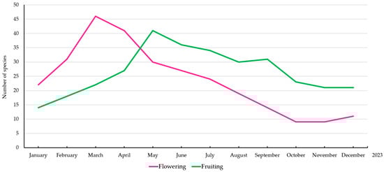 - McLaren, K.P.; McDonald, M.A. Seasonal patterns of flowering and fruiting in a dry tropical forest in Jamaica. Biotropica 2005, 37, 584–590. [Google Scholar] [CrossRef]