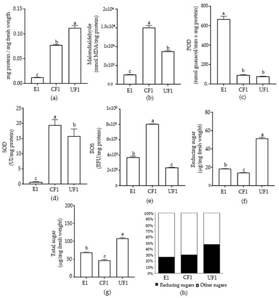 Biochemical analysis of ‘Merensky 2’ avocado rootstock stem sections collected at the end of the first vegetative flush. Parameters assessed include (a) Protein content (relative to fresh weight), (b) Malondialdehyde (MDA) content, (c) Peroxidase (POD) activity, (d) Superoxide dismutase (SOD) activity, (e) Reactive oxygen species (ROS) levels, (f) Reducing sugar, (g) Total sugar and (h) Ratio of reducing sugar-to-total sugars. Treatments: E1—etiolated material; CF1—field material covered for 30 days; UF1—uncovered field material. Bars with different letters denote statistically significant differences (ANOVA, Tukey’s test, p ≤ 0.05).