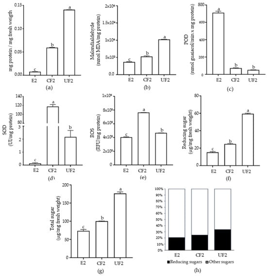 For the second vegetative flush, significant differences (p ≤ 0.05) were found in ROS levels, antioxidant activity, and MDA content. Protein content (Figure 2a) was highest in UF2, followed by CF2, and lowest in E2. MDA content (Figure 2b), an indicator of oxidative stress, was also highest in UF2, intermediate in CF2, and lowest in E2. POD activity (Figure 2c) was greatest in E2 and lower in both CF2 and UF2. SOD activity (Figure 2d) peaked in UF2, followed by CF2, and was lowest in E2. ROS levels (Figure 2e) were highest in CF2, moderate in UF2, and lowest in E2. In addition, analysis of reducing sugar content (Figure 2f) and total sugar content (Figure 2g) showed that UF2 exhibited the highest total sugar levels, followed by CF2, with E2 showing the lowest values. Reducing sugar content was highest in UF1, with lower values in CF2 and E2. The ratio of reducing-to-total sugar content (Figure 2h) was greatest in UF2, while E2 and CF2 displayed similar lower ratios.