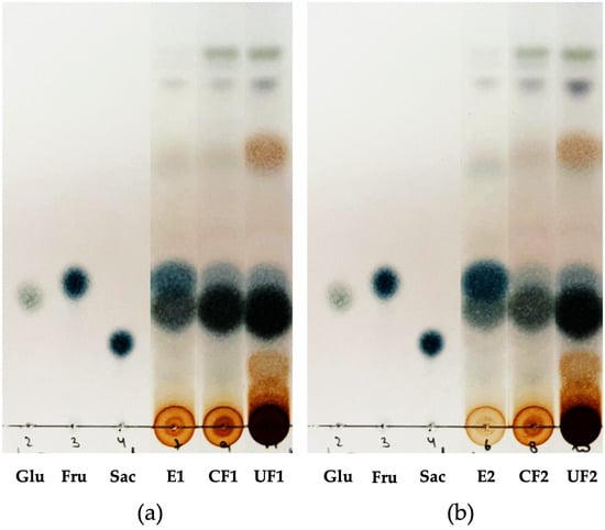 For the first vegetative flush, thin-layer chromatography (TLC) analysis of sugars (Figure 3a) yielded qualitative results, with stain intensity reflecting the relative abundance of each compound. Fructose content was higher in E1 compared to CF1 and UF1, whereas glucose was more abundant in CF1 and UF1 than in E1. Sucrose was not detected in any of the treatments.