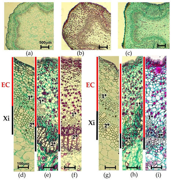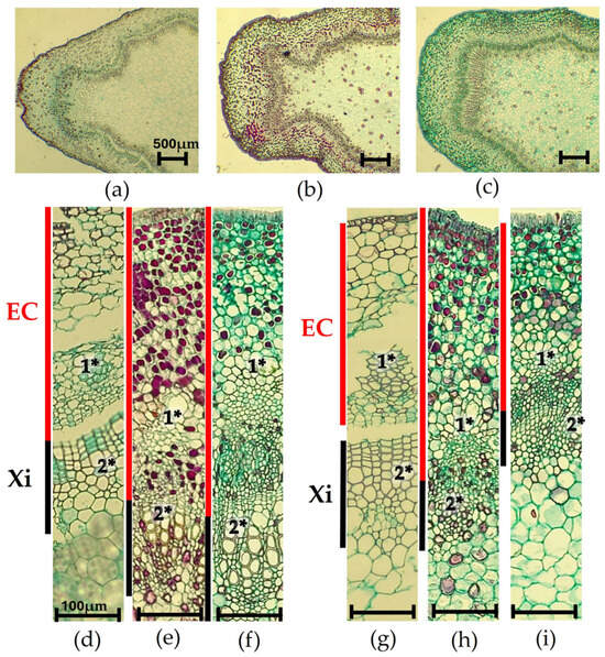 Transverse sections of ‘Merensky 2’ avocado rootstock stems collected and fixed in FAA at the end of the second vegetative flush: (a) etiolated material, (b) covered field material for 30 days, (c) uncovered field material, (d) etiolated material (zone 1), (e) covered field material for 30 days (zone 1), (f) uncovered field material (zone 1), (g) etiolated material (zone 2), (h) covered field material for 30 days (zone 2), (i) uncovered field material (zone 2). Key: EC = distance from epidermis to cambial zone, Xi = xylem zone length, 1* = phloem fibers, 2* = xylem vessels. Scale bars: (a–c) 500 μm; (d–i) 100 μm.