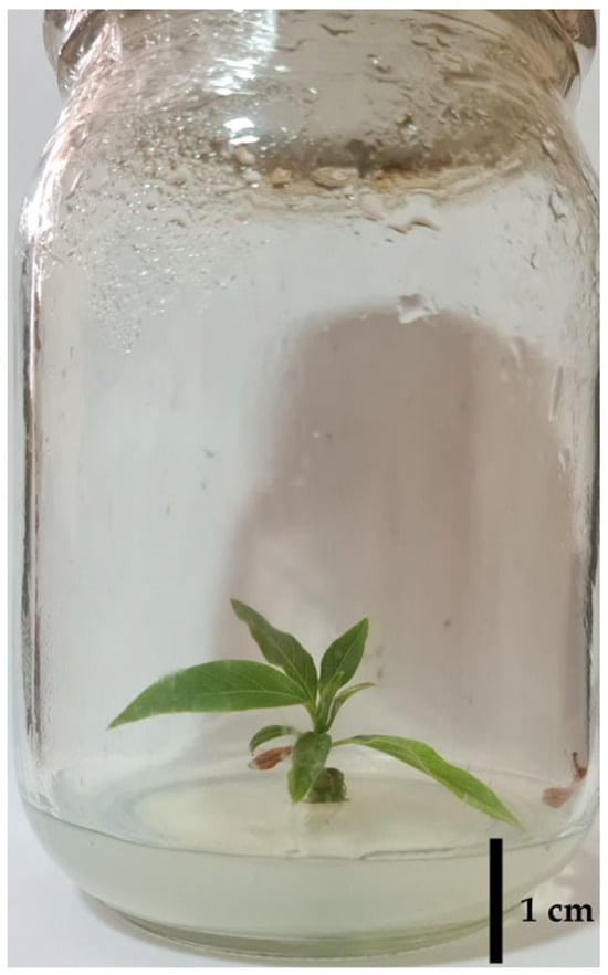 During the establishment stage, factors such as pre-disinfection and disinfection of the plant material, the type and quality of the explant, the culture medium, and growth regulators are essential. Pre-disinfection and disinfection are critical steps to reduce losses caused by microorganisms, such as bacteria and fungi [25], which represent a major problem during this stage of in vitro culture [17]. For this purpose, fungicides and/or bactericides are used in pre-disinfection [25] and disinfectants, such as sodium hypochlorite, in disinfection, in order to reduce microbial contamination and achieve asepsis [26,27].