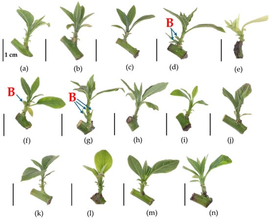 Shoot growth of ‘Merensky 2’ avocado rootstock explants in vitro, 30 days after initiation of hormonal treatments. (a–h): BAP and GA3. (i–n): MT and GA3. (a) Control (no hormones), (b) 0.29 µM GA3, (c) 4.44 µM BAP, (d) 8.88 µM BAP, (e) 13.32 µM BAP, (f) 4.44 µM + 0.29 µM GA3, (g) 8.88 µM BAP + 0.29 µM GA3, (h) 13.32 µM BAP + 0.29 µM GA3. (i) Control; (j)T1: 0.41 µM MT; (k)T2: 0.83 µM MT; (l)T3: 0.29 µM GA3; (m)T4: 0.41 µM MT + 0.29 µM GA3; (n)T5: 0.83 µM MT + 0.29 µM GA3. B = axial bud sprouting. Scale bar: 1 cm.