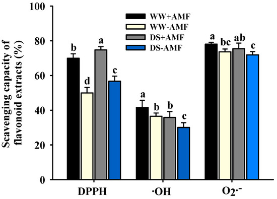 - Liu, X.Q.; Cheng, S.; Aroca, R.; Zou, Y.N.; Wu, Q.S. Arbuscular mycorrhizal fungi induce flavonoid synthesis for mitigating oxidative damage of trifoliate orange under water stress. Environ. Exp. Bot. 2022, 204, 105089. [Google Scholar] [CrossRef]