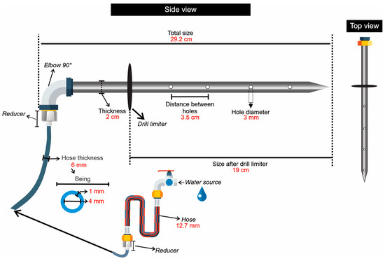 - Injection method: A device with a fine tip, approximately 2 cm in diameter, was introduced into the center of the substrate (rectangular and cylindrical blocks) to a depth of 19 cm. This water injection equipment was designed to facilitate the process of water stress induction. During the procedure, water was injected at a flow rate of 0.045 L per second. The injection rod remained inserted in the block for a duration proportional to the block’s weight: 34 s for 2 kg blocks and 60 s for 3.5 kg blocks. To assemble the water injection system for the cultivation blocks, the following materials and configurations were employed, as exemplified in Figure 2:
