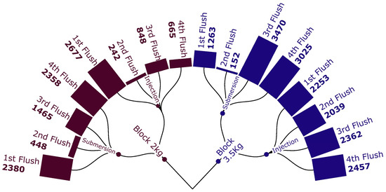- Submersion method: The substrate (rectangular cube and cylindrical blocks) was transferred to tanks filled with water until they were completely submerged, for 8 h. The tank has a volume measurement of 2.05 × 0.57 × 0.84 m. After this period, the blocks were removed and relocated to the cultivation chamber, maintaining the previous environmental conditions.