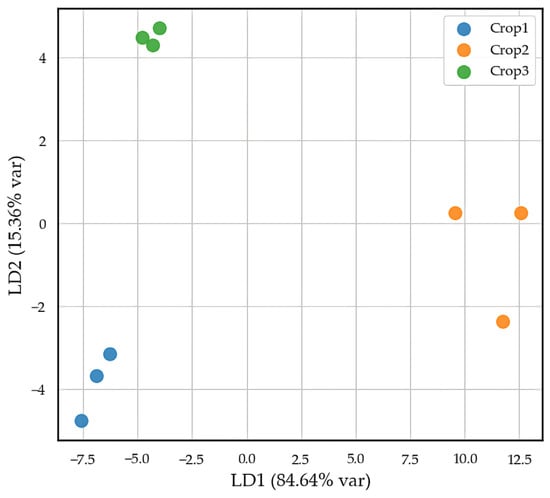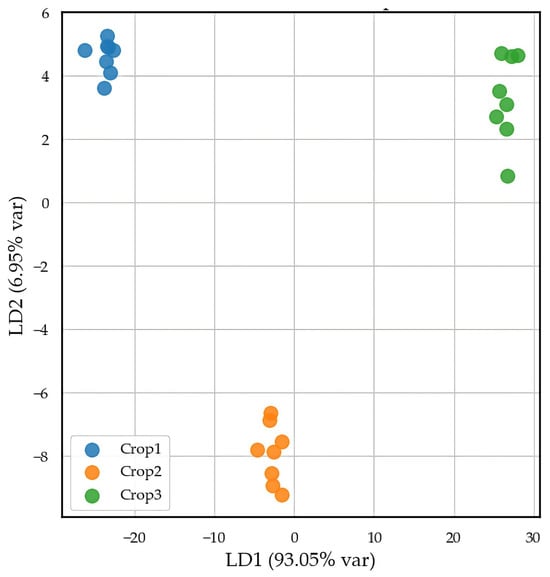 LDA applied to the elemental profiles of pistachio kernels yielded an average classification accuracy of 74.44% ± 10.00% across 10 cross-validation runs. Classification results remained consistent for Crops 1 and 2, whereas several samples from Crop 3 appeared grouped with other classes. The first and second canonical functions (LD1 and LD2) accounted for 84.64% and 15.36% of the total variance, respectively. The most influential variables in the model were rubidium (Rb), strontium (Sr), and manganese (Mn), followed by copper (Cu) and zinc (Zn). Figure 2 displays the distribution of kernel samples in the LD1–LD2 projection space.