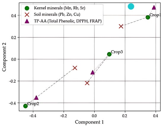 The generalized Procrustes analysis (GPA) revealed a strong structural alignment between the mineral composition of pistachio kernels (Mn, Rb, Sr) and their antioxidant properties (total phenolics, DPPH, FRAP), particularly in Crop1 and Crop3. In contrast, the spatial congruence between soil mineral content (Pb, Zn, Cu) and kernel composition was lower, suggesting that the internal nutrient profile of the fruit is more directly associated with its functional traits.