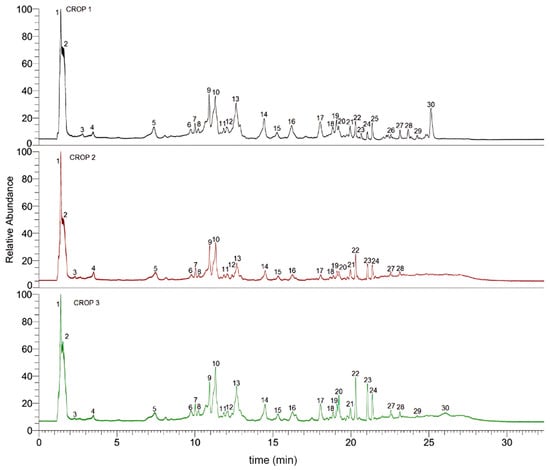 UHPLC-Orbitrap MS (TIC, total ion current) chromatograms of Crop 1, Crop 2, and Crop 3.