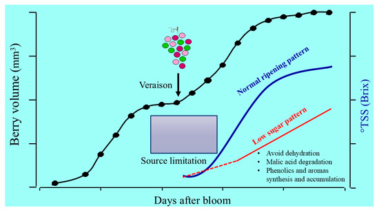 A valuable tool for determining whether a given LA/Y estimated at veraison is limiting, and consequently leads to a slower and less efficient sugar accumulation pattern, is derived from modeling. As noted in [25], a weather-based seasonal model has been developed to dynamically estimate the LA/Y ratio, which is useful for assessing whether a source limitation exists at the critical time of veraison. However, the ripening ideotype illustrated in Figure 1 offers even greater flexibility if the ultimate goal is a reduced TSS. Indeed, regardless of the current LA/Y ratio at the onset of veraison, there are tools and techniques available to impose a calibrated source limitation, some of which will be discussed in a subsequent chapter of this review.