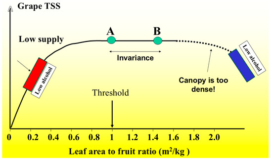 The general relationship between the leaf area-to-yield ratio and grape TSS suggests that a low final alcohol content is expected when the source is either significantly limited (red) or excessively abundant (blue). The latter can result in excessive cluster shading and intense vegetative competition. Line segment comprised between A and B indicates a range of source adequacy.