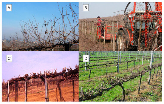 When working with cultivars that exhibit high basal node fruitfulness, it becomes relatively straightforward to adjust yield beyond the threshold where leaf area (LA) becomes limited, leading to a significant restriction in sugar accumulation. This aligns with the ultimate goal of producing low-alcohol wines. The most effective approach to achieve this involves short winter mechanical pruning, with or without gentle hand finishing, on permanent cordon training systems such as spur-pruned permanent cordons, T trellises, GDC trellises, and single high wire trellises (Figure 3). When combined with mechanical grape harvesting, managing these training systems becomes particularly attractive, as the high yield is associated with a relatively limited number of working hours per hectare [49,50,51]. Ultimately, the renewed interest in low-alcohol products may serve as a kind of “vindication” for the use of mechanical pruning in viticulture, which has historically been criticized for disregarding quality, vine health, and longevity [47].