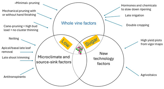 The interplay among various factors—such as the whole vine, microclimate, source–sink dynamics, and new technology—affects low sugar levels at harvest. For each factor, specific cultural practices are recommended.