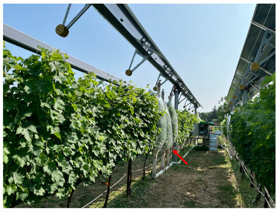 - Ahn, S.Y.; Lee, D.B.; Lee, H.I.; Myint, Z.L.; Min, S.Y.; Kim, B.M.; Oh, W.; Jung, J.H.; Yun, H.K. Grapevine growth and berry development under the agrivoltaic solar panels in the vineyards. J. Bio-Environ. Control 2022, 31, 356–365. [Google Scholar] [CrossRef]