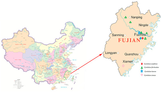 The orchid genus Cymbidium is globally recognized as an important ornamental plant, admired for its unique flower shapes and rich cultural significance. It holds a prominent position in the horticultural industry and also possesses notable medicinal and ecological value [1]. As one of the centers of origin and diversity for orchids, China, particularly Fujian Province, has rich Orchidaceae species resources owing to its complex topography and diverse climatic conditions. Fujian serves as a key region for both the natural distribution and artificial cultivation of orchids [2,3]. The orchid species in Fujian exhibit a high level of diversity, not only in species composition but also in their genetic adaptability and potential for differentiation. However, in recent years, orchid populations in the wild have been severely threatened by habitat degradation, overharvesting, and climate change, leading to a decline in genetic diversity [4].